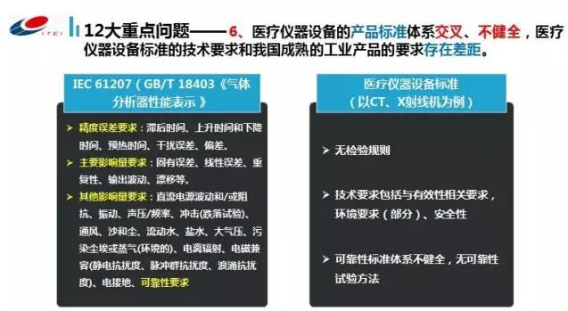 第六,醫(yī)療器械除了國家標準以外,衛(wèi)生標準、醫(yī)療器械標準有多頭管理,多頭管理存在著很多交叉和不健全,這是一個對比表,那邊是醫(yī)療器械的標準,這邊是相對成熟的工業(yè)產品的標準,從兩者的規(guī)定上來講,工業(yè)產品的規(guī)定要比醫(yī)療器械多得多、細得多,就便于產品質量檢驗檢查的可靠性。