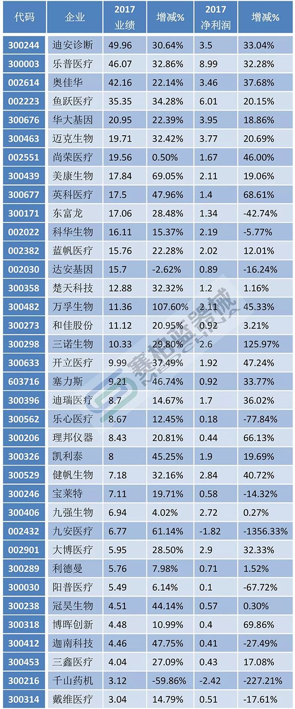 華大基因,作為基因檢測生產第一股,2017年業績超20億,收入利潤均雙位增長,而另一個同樣站在國產IVD產品潮流風向上的迪瑞醫療,業績在10億之下。另外,IVD渠道商塞力斯也有不俗表現,業績為9.99億元,收入利潤均高位增長。