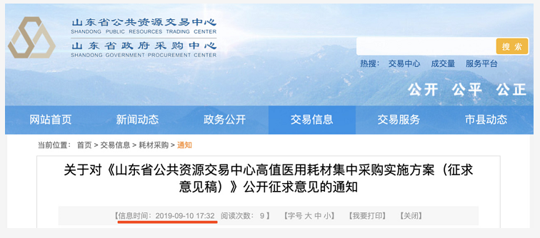 昨日(9月10日),山東省公共資源交易中心發布關于對“高值醫用耗材集中采購實施方案”公開征求意見的通知。
