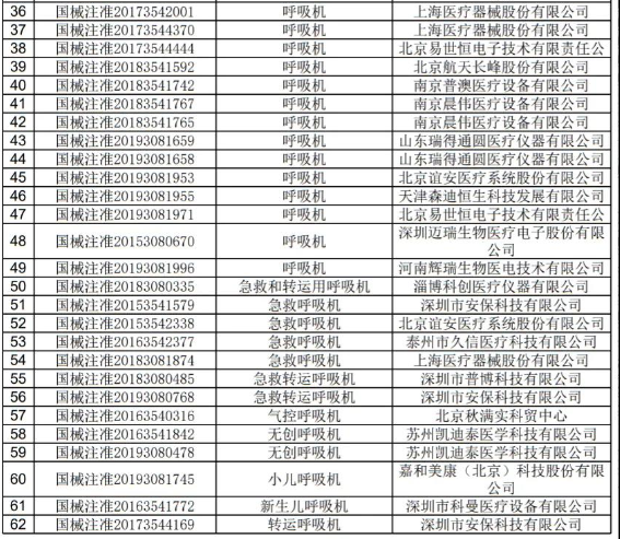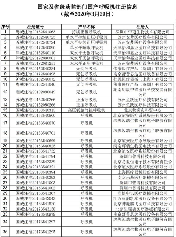 附:國產呼吸機注冊信息,來源于國家藥監局官網