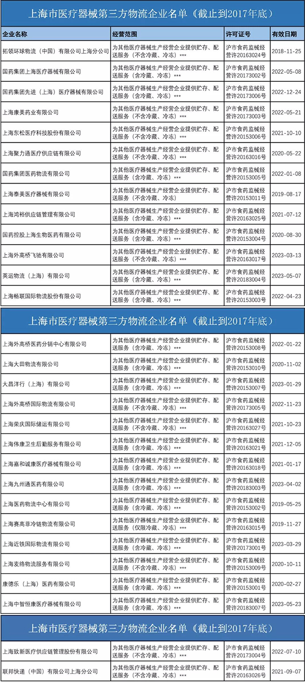 附:上海市醫療器械第三方物流企業名單(截止到2017年底)