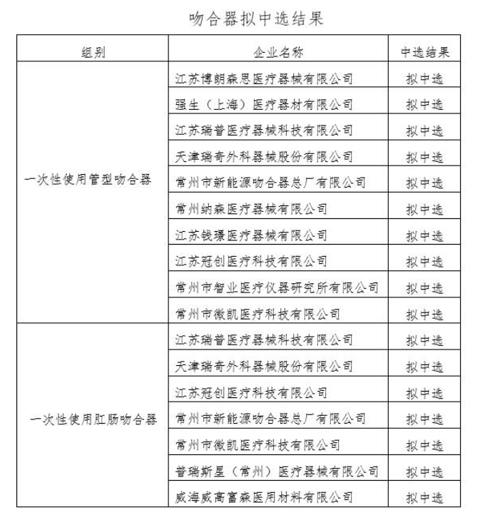 吻合器擬中選結果包括強生、威高、天津瑞奇等械企;