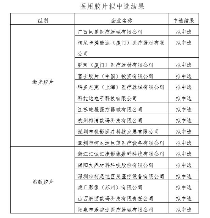 醫用膠片擬中選結果包括富士、柯尼達、銳珂等械企;