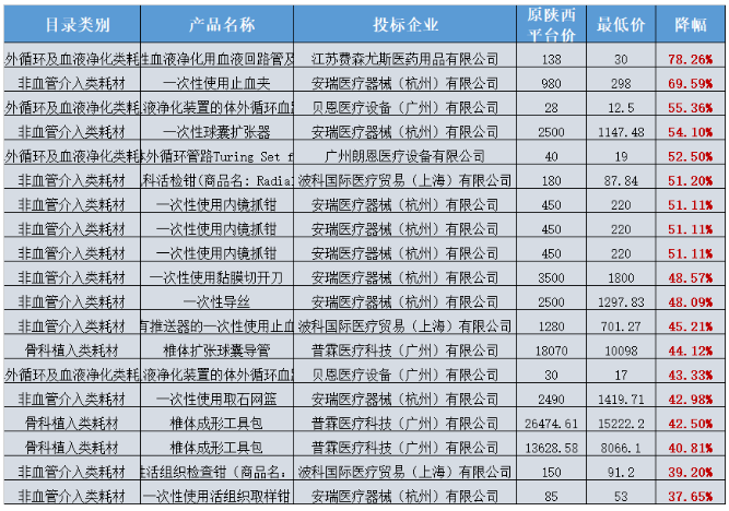除此之外,本次還有雅培、波科國際、上海微創、樂普、庫克、費森尤斯等22家企業118種高值耗材價格再度調低,最高降幅高達78%。