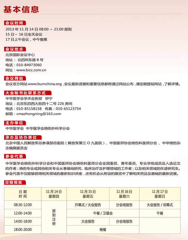 本次會議為中華醫學會一類學術會議,系國家級繼續教育項目,項目編號:2013-04-03-027 (國),全體參會代表可獲得國家級Ⅰ類繼續教育項目學分。屆時國內外著名專家將齊聚北京,針對燒傷專業前沿及熱點問題進行學術交流和探討。文稿被收入會議匯編后,可在當年“中國重要會議論文全文數據庫”中檢索并閱讀。