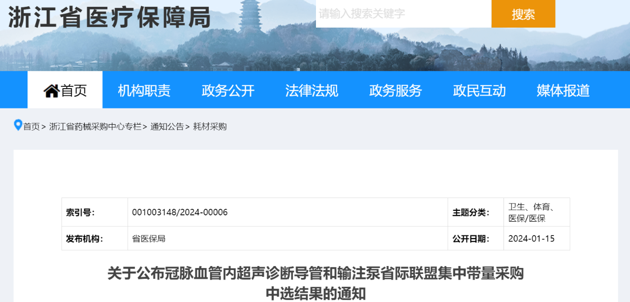 1月15日,浙江醫保局發布《關于公布冠脈血管內超聲診斷導管和輸注泵省際聯盟集中帶量采購中選結果的通知》。