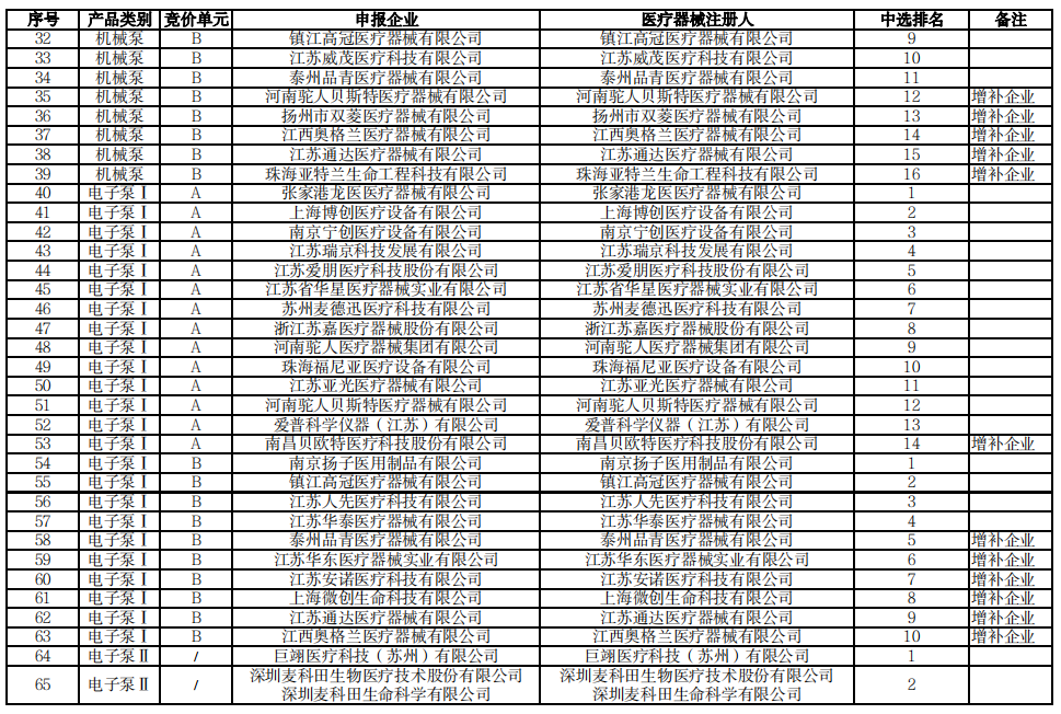 輸注泵中選結果如下: