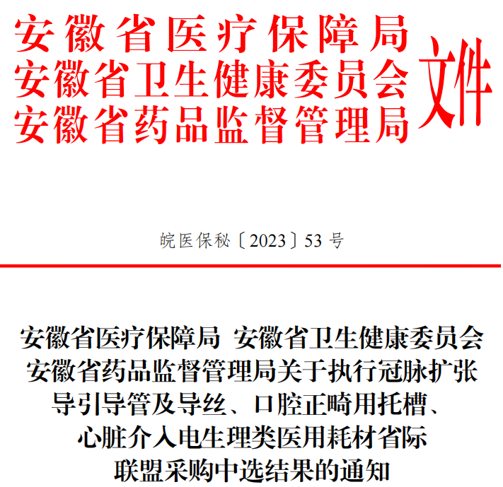 近日,安徽省醫保局、省衛健委、省藥監局三部門聯合發布“關于執行冠脈擴張導引導管及導絲、口腔正畸用托槽、心臟介入電生理類醫用耗材省際聯盟采購中選結果的通知”。