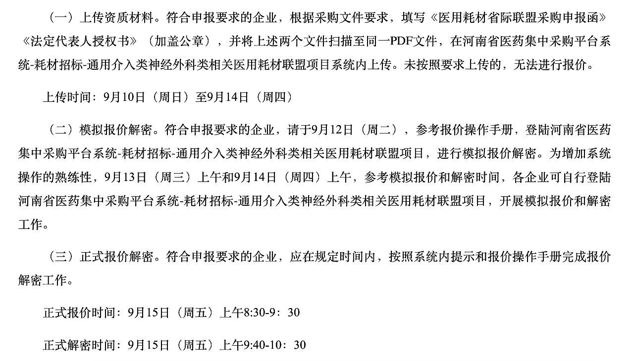 今日(9月10日),河南省醫(yī)保局發(fā)布《關(guān)于通用介入類(lèi)和神經(jīng)外科類(lèi)醫(yī)用耗材省際聯(lián)盟采購(gòu)的公告(五)》,公布將于近期開(kāi)展產(chǎn)品價(jià)格申報(bào)工作,并召開(kāi)企業(yè)報(bào)價(jià)培訓(xùn)會(huì)。