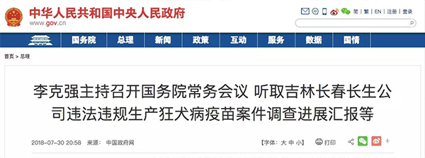 昨日(7月30日),總理主持召開國(guó)務(wù)院常務(wù)會(huì)議,聽取吉林長(zhǎng)春長(zhǎng)生公司違法違規(guī)生產(chǎn)狂犬病疫苗案件調(diào)查進(jìn)展匯報(bào)。