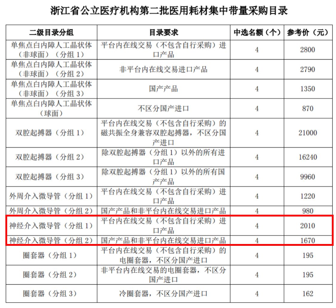 今年9月,浙江省藥械采購平臺公布的省公立醫院第二批醫用耗材集中帶量采購目錄中,涉及神經介入類產品。