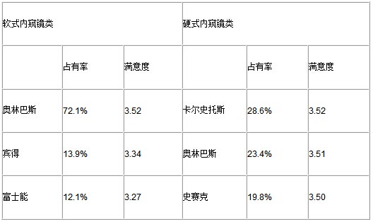 在軟式內窺鏡類,奧林巴斯獨占鰲頭其市場占有率達到驚人的72.1%,同時用戶滿意度也位居該類第一;而在硬式內窺鏡類,前三強企業的滿意度也幾乎一樣,而在市場占有率方面三家企業也較均衡,呈現出三強鼎立局面。