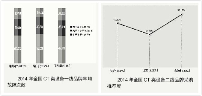 以上公布的數據直觀的反映出了,去年度各類產品線的主流品牌和用戶的滿意度。此外,這次報告增加了“設備年故障次數和推薦”兩項附加指標,使得報告數據對于采購更具參考性。以CT類、磁共振MRI類和超聲影像類為例:
