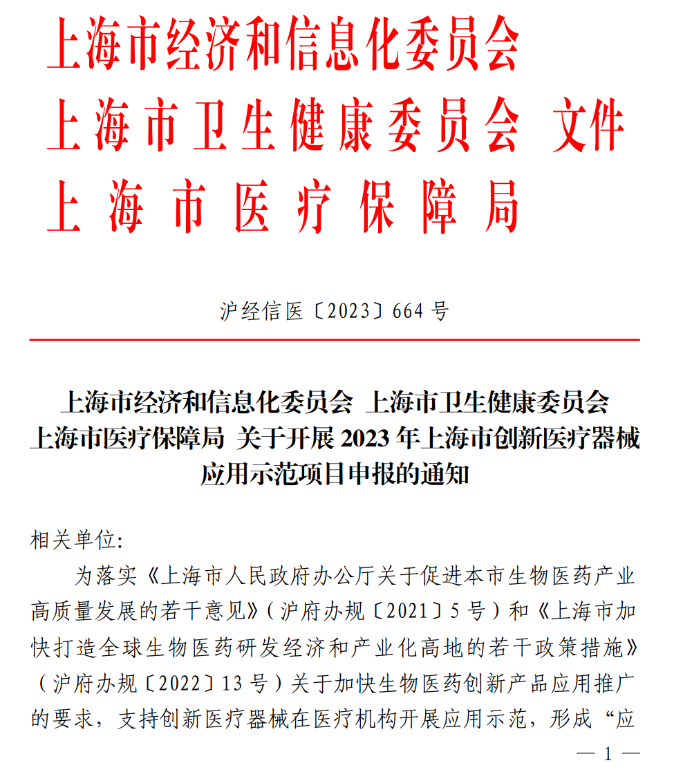 近日,上海市經信委發布《上海市經濟和信息化委員會 上海市衛生健康委員會 上海市醫療保障局 關于開展2023年上海市創新醫療器械應用示范項目申報的通知》(以下簡稱《通知》)。