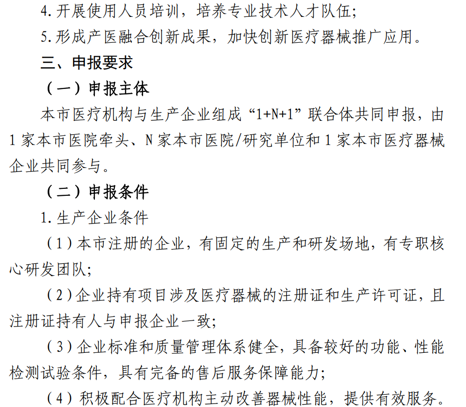 根據《通知》,由上海市醫療機構與生產企業組成“1+N+1”聯合體共同申報,由1家本市醫院牽頭、N家本市醫院/研究單位和1家本市醫療器械企業共同參與。