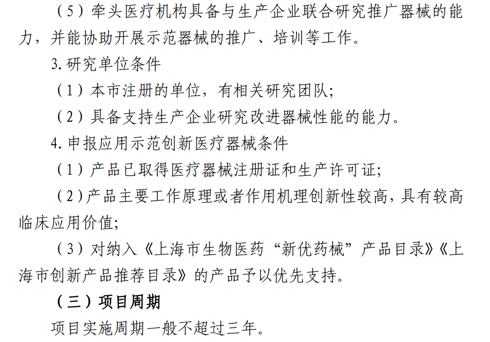 (1)取得醫療器械注冊證和生產許可證;(2)產品主要工作原理或者作用機理創新性較高,具有較高臨床應用價值;(3)對納入《上海市生物醫藥“新優藥械”產品目錄》《上海市創新產品推薦目錄》的產品予以優先支持。