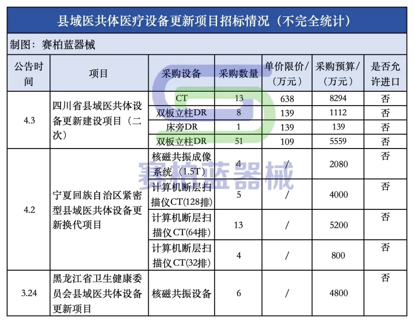 據(jù)賽柏藍(lán)器械梳理,湖南、四川、河北、黑龍江、河南、寧夏等多地已先后推進(jìn)縣域醫(yī)共體設(shè)備更新工作,采購設(shè)備包括核磁、CT、DR、超聲、全自動(dòng)生化分析儀、生化、救護(hù)車等。
