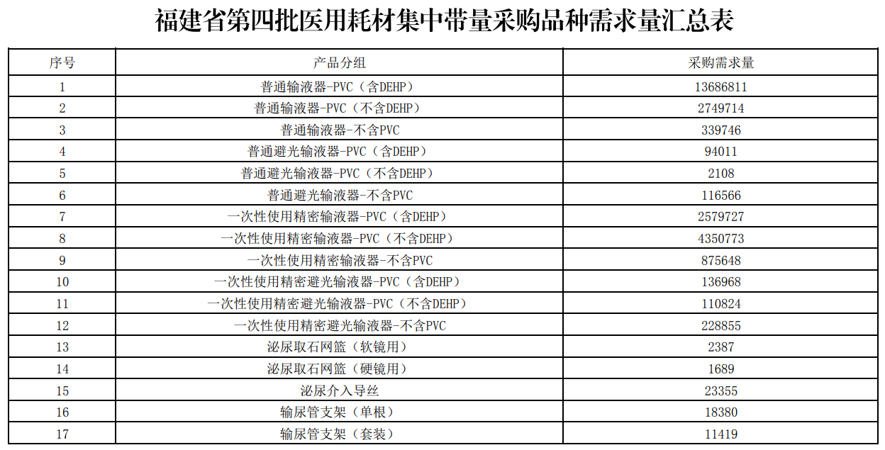 根據此前發布的《福建省第四批醫用耗材集中帶量采購文件(征求意見稿)》,本次集采將圍繞輸液器、泌尿取石網籃、泌尿介入導絲、輸尿管支架等4類醫用耗材進行開展。
