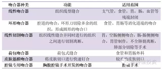根據適用范圍不同,吻合器主要可分為線性吻合器、環形吻合器、線性切割吻合器、荷包吻合器、皮膚筋膜吻合器和腹腔鏡專用吻合器等。