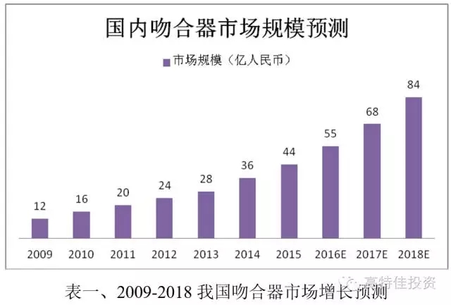 吻合器屬于外科手術器械。根據《國民經濟行業分類》,吻合器屬于醫療儀器設備及器械制造中的“醫療、外科及獸用器械制造”小類(分類代碼:3584)。據估計2014年我國吻合器市場規模為36億元,隨著我國微創手術需求的快速增長,2018年我國吻合器市場規模將達到84億元,CAGR為17%。