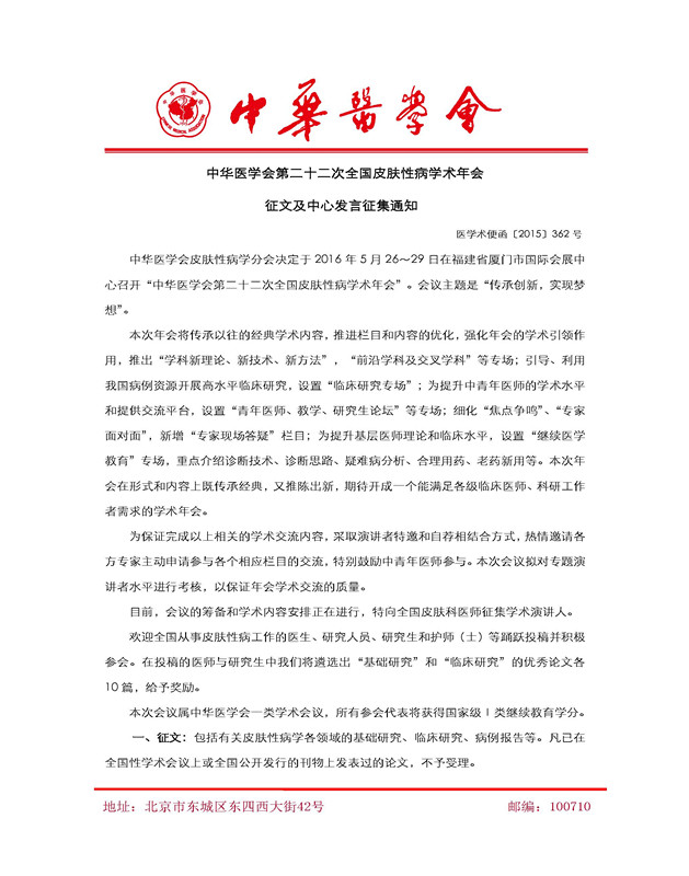 中華醫學會皮膚性病學分會決定于2016年5月26~29日在福建省廈門市國際會展中心召開“中華醫學會第二十二次全國皮膚性病學術年會”。會議主題是“傳承創新,實現夢想”。