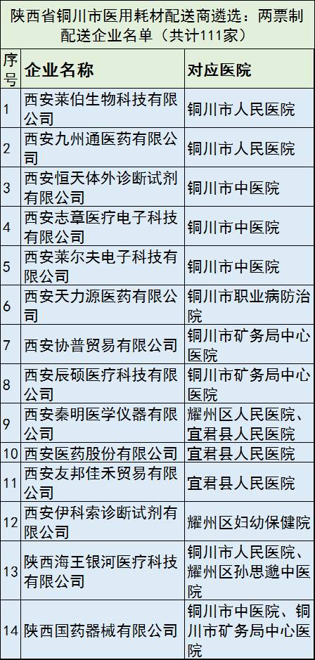 6月22日,陜西省銅川市衛計局發布了銅川市城市公立醫院藥品、耗材配送企業遴選結果公示,共有71家配送商拿到了該市耗材“兩票制”新政下的配送資格。