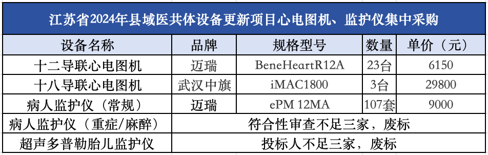 同日,江蘇省2024年縣域醫(yī)共體設(shè)備更新項(xiàng)目心電圖機(jī)、監(jiān)護(hù)儀集中采購(gòu)項(xiàng)目也公布了中標(biāo)結(jié)果,邁瑞、武漢中旗中標(biāo),另有病人監(jiān)護(hù)儀(重癥/麻醉)、超聲多普勒胎兒監(jiān)護(hù)儀兩個(gè)包廢標(biāo)。