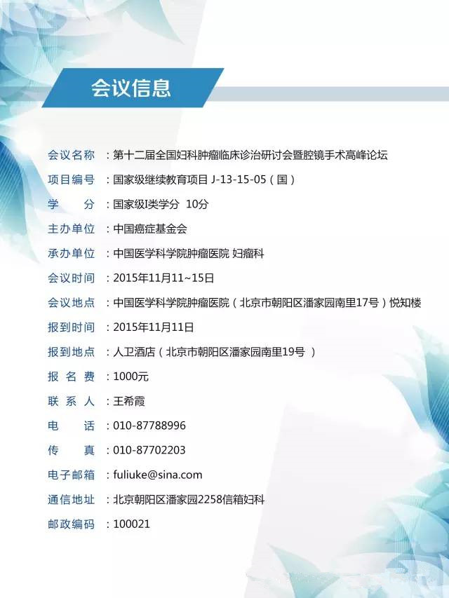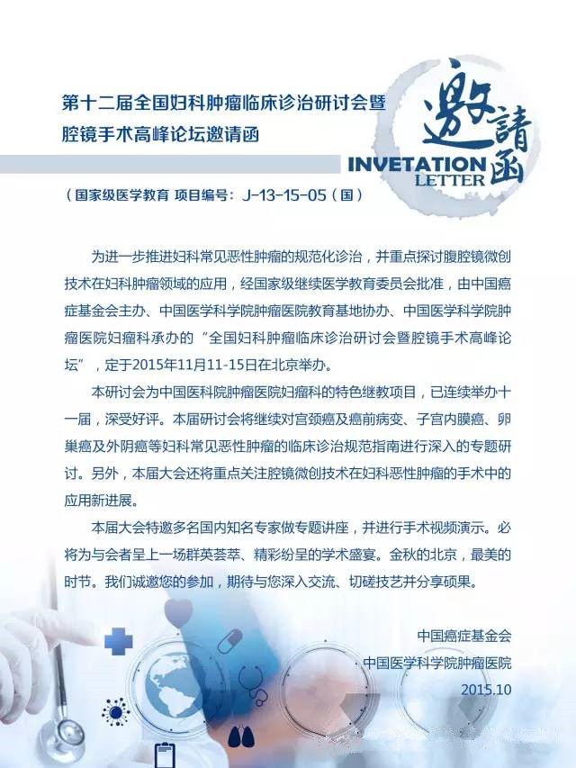 為進(jìn)一步推進(jìn)婦科常見惡性腫瘤的規(guī)范化診治,并重點(diǎn)探討腹腔鏡微創(chuàng)技術(shù)在婦科腫瘤領(lǐng)域的應(yīng)用,經(jīng)國家級醫(yī)學(xué)教育委員會批準(zhǔn),第十二屆全國婦科腫瘤臨床診治研討會暨腔鏡手術(shù)高峰論壇 將于2015年11月11-15日在北京舉辦。