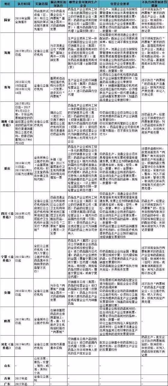 陜西:繼安徽之后,陜西也發文執行兩票制,2017年1月1日起實施,目前已有一些醫院明確了執行時間。相比安徽,陜西的動作顯得小一些,目前還未出臺具體實施細則,只有寶雞市發布了兩票制配送工作實施意見,自2016年12月1日起實施兩票制。