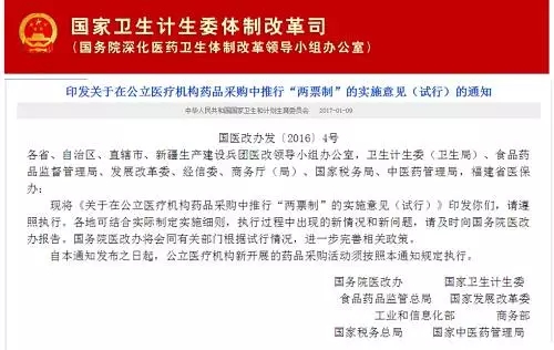 1月9日,國家衛(wèi)生計生委體制改革司(國務(wù)院深化衛(wèi)生體制改革領(lǐng)導(dǎo)小組辦公室)在衛(wèi)計委官網(wǎng)發(fā)布了印發(fā)《關(guān)于在公立醫(yī)療機構(gòu)藥品采購中推行“兩票制”的實施意見(試行)》的通知,要求:自通知發(fā)布之日起,公立醫(yī)療機構(gòu)新開展的藥品采購活動須按照本通知規(guī)定執(zhí)行。