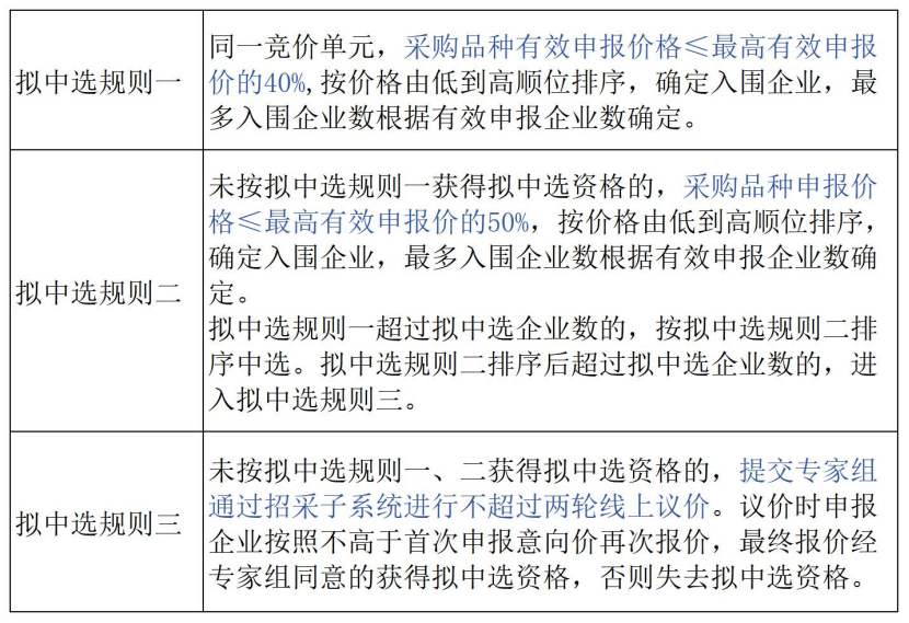 采購品種規格不足三家申報的或確因產品材質、結構等有明顯區別單列的,通過招采子系統進行不超過兩輪磋商撮合。磋商撮合時申報企業按照不高于首次申報意向價再次報價,最終報價經專家組同意的獲得擬中選資格,否則失去擬中選資格。