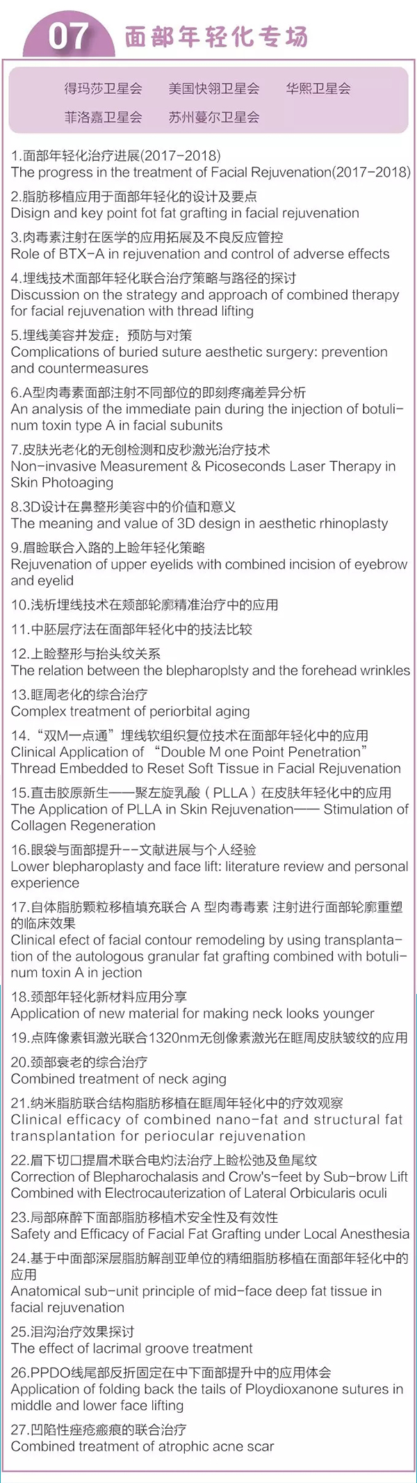 主辦單位:中國整形美容協會微創與皮膚整形美容分會 · 脂肪醫學分會新技術與新材料分會 · 乳房整形分會激光美容分會 · 皮膚美容分會眼整形美容分會 · 面部年輕化分會鼻整形美容分會 · 內窺鏡整形外科分會
