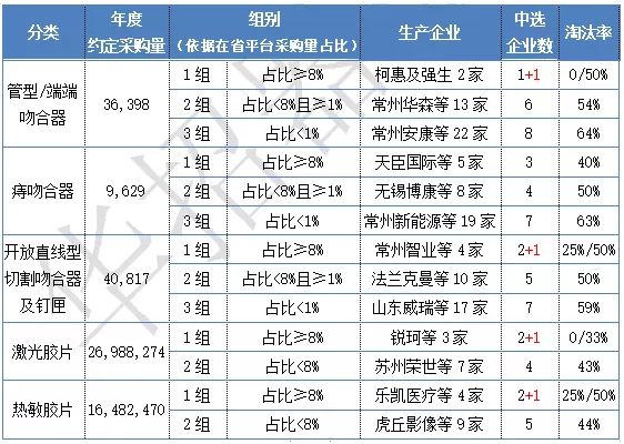 從具體分組情況來(lái)看,管吻、痔吻、開(kāi)放吻合器各分3組,以采購(gòu)量占比“8%”及“1%”作為切割線;激光、熱敏膠片各分2組,以采購(gòu)量占比“8%”為界。這次談判整體淘汰率將在50%左右,占比越低,分組內(nèi)競(jìng)爭(zhēng)越激烈,企業(yè)淘汰率越高。