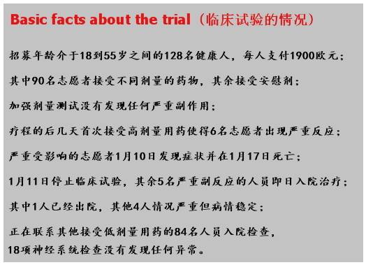4月份,法國國家藥品衛生品管理局發布報告:指出該臨床試驗設計不合理,連續5天給患者增大劑量注射藥物可能是造成嚴重副作用的罪魁禍首。