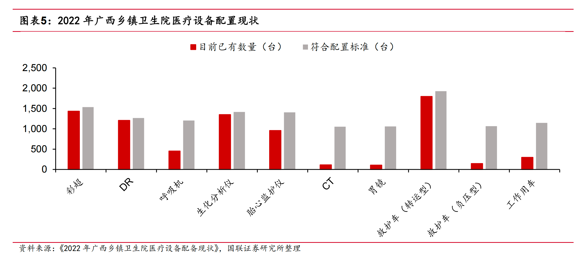 以廣西省為例,根據《鄉鎮衛生院服務能力標準( 2022 版)》,其鄉鎮衛生院基礎醫療設備如 CT、胃鏡、救護車和呼吸機等仍有較大缺口。