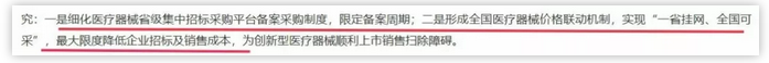 國家醫(yī)保局強(qiáng)調(diào),將細(xì)化醫(yī)療器械省級(jí)集中招標(biāo)采購平臺(tái)備案采購制度,限定備案周期;形成全國醫(yī)療器械價(jià)格聯(lián)動(dòng)機(jī)制,實(shí)現(xiàn)“一省掛網(wǎng)、全國可采”,最大限度降低企業(yè)招標(biāo)及銷售成本。