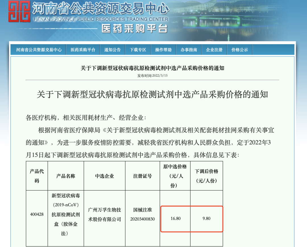 3月15日,廣東省藥品交易中心發布《關于調整新型冠狀病毒(2019-nCoV)檢測試劑聯盟地區集團帶量采購部分中選品種價格的通知》。需要注意的是,中選企業廣州萬孚生物技術股份有限公司主動申請其中選產品新型冠狀病毒(2019-nCoV)抗原檢測試劑盒(膠體金法)(國械注準20203400830)中選價格調整為9.8元/人份。