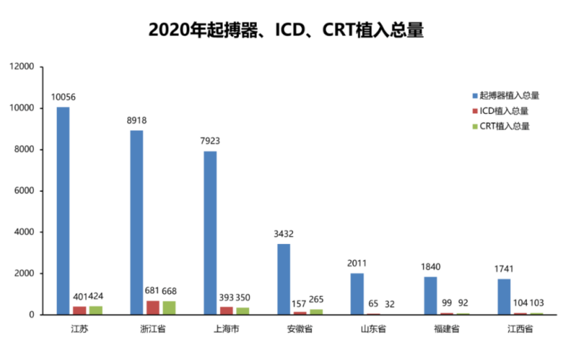 根據第二十五屆全國介入心臟病論壇(CCIF 2022)發布數據,2021年心臟起搏器植入總量約11.16萬例,較2020年增加12.5%。核磁共振兼容起搏器占比從2019年的23%增加至2021年的39%。江蘇、浙江、上海植入量最多。