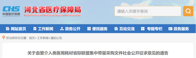 10月16日,河北醫保局發布《關于血管介入類醫用耗材省際聯盟集中帶量采購文件社會公開征求意見的通告》(附文末)。