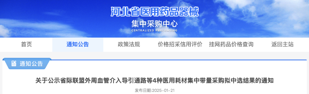 1月21日,河北省醫(yī)用藥品器械集中采購(gòu)中心發(fā)布《關(guān)于公示省際聯(lián)盟外周血管介入導(dǎo)引通路等4種醫(yī)用耗材集中帶量采購(gòu)擬中選結(jié)果的通知》,公示時(shí)間為2025年1月22日至2025年1月27日。