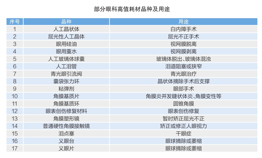 就產業鏈下游而言,近年來,我國政府部門頻出利好政策,鼓勵社會辦醫,民營眼科醫療機構隊伍逐漸發展壯大,對眼科高值耗材的采購需求增加。未來國家高值醫用耗材集中帶量采購或導致部分產品院端市場重新分配,市場迎來新一輪洗牌。研發能力強、產品布局完善的國內企業將脫穎而出,與外資企業展開同臺競爭。