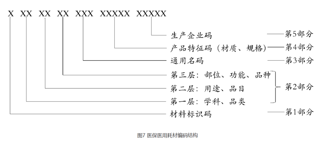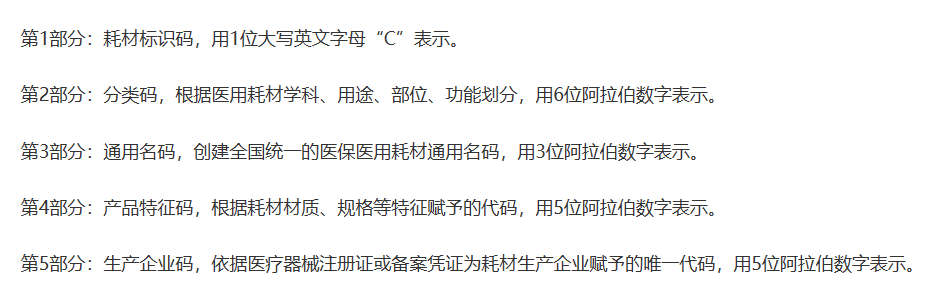 根據(jù)國(guó)家醫(yī)保局印發(fā)的《醫(yī)療保障標(biāo)準(zhǔn)化工作指導(dǎo)意見(jiàn)》,醫(yī)保醫(yī)用耗材編碼分5個(gè)部分共20位,通過(guò)大寫英文字母和阿拉伯?dāng)?shù)字按特定順序排列表示。其中第1部分是耗材標(biāo)識(shí)碼,第2部分是分類碼,第3部分是通用名碼,第4部分是產(chǎn)品特征碼,第5部分是生產(chǎn)企業(yè)碼。
