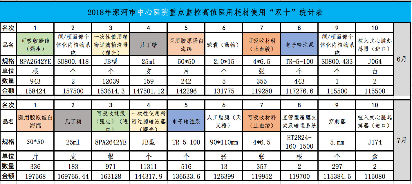 梳理漯河市衛(wèi)計委發(fā)布的6月、7月耗材用量公示數據,數十個耗材產品兩次進入了前十名。
