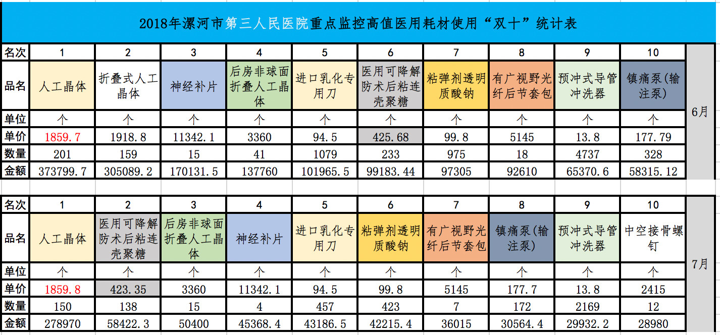 漯河市第三人民醫(yī)院6月、7月“雙十”統計表顯示,各月的前十名里,有9種耗材產品重復。即,前十名中的九個位置被固定產品占據,可想而知這些產品被限用、停用的風險之大。