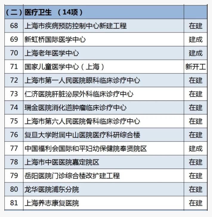 2021年上海市重大建設項目清單,在166項正式項目中,共涵蓋了14項醫療衛生相關建設內容。重點建設??圃\療中心,共有在建10項目、計劃建成3項、計劃新開工1項。建設方向包括疾病預防控制中心、老年兒童醫學中心以及肝臟、泌尿、腫瘤等多項??圃\療中心。
