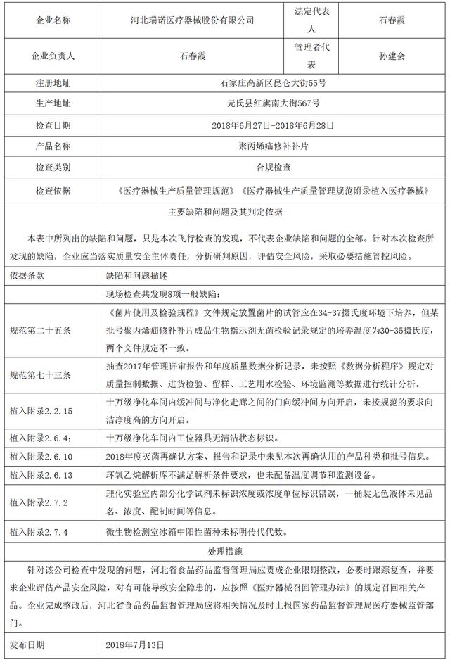 對河北瑞諾醫療器械股份有限公司飛行檢查通報