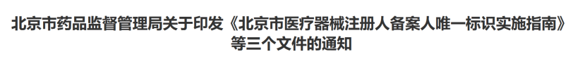 近日,北京市藥監局、北京市衛健委、北京市醫保局發布《關于做好第三批實施醫療器械唯一標識工作的通知》(以下簡稱《通知》),北京市藥監局還制定印發了《北京市醫療器械注冊人備案人唯一標識實施指南》《北京市醫療器械經營企業唯一標識實施指南》《北京市醫療機構醫療器械唯一標識實施指南》。