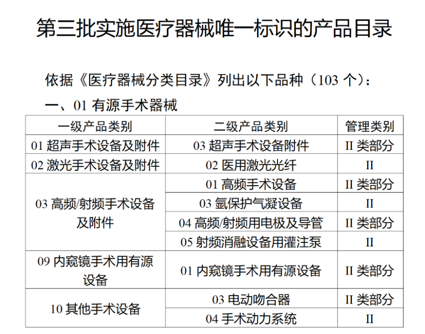 第三批醫療器械唯一標識實施品種共包括103種二類醫療器械,有超聲手術設備、激光手術設備及附件、高頻/射頻手術設備及附件、內窺鏡手術用有源設備、神經和心血管手術器械-心血管介入器械、骨科手術器械、診斷X射線機、光治療設備、起搏系統分析設備、注射泵、臨床檢驗器械等。