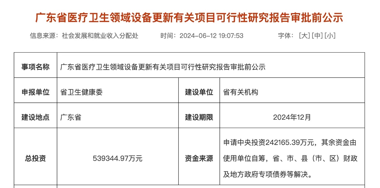 6月12日,廣東發(fā)改委官網(wǎng)發(fā)布《廣東省醫(yī)療衛(wèi)生領(lǐng)域設(shè)備更新有關(guān)項目可行性研究報告審批前公示》(以下簡稱《公示》)。
