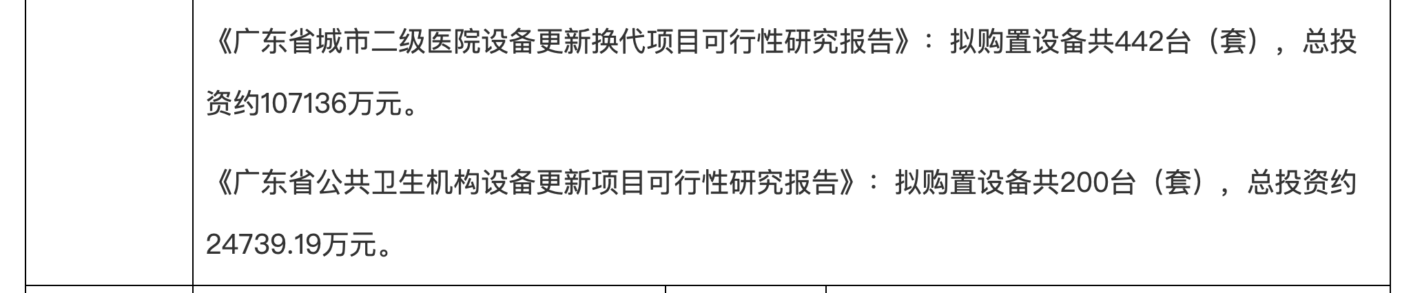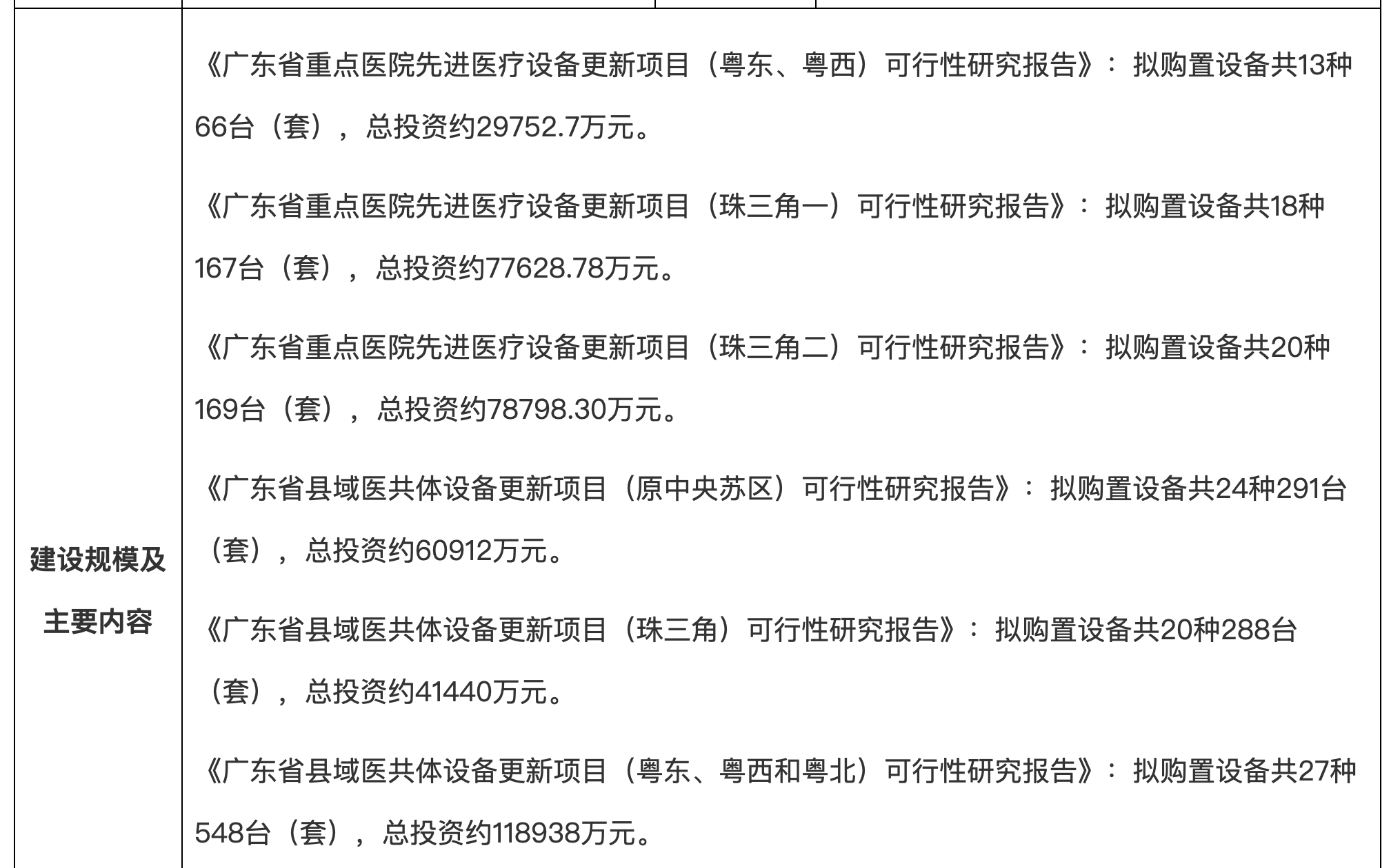 《廣東省縣域醫(yī)共體設(shè)備更新項目(珠三角)可行性研究報告》:擬購置設(shè)備共20種288臺(套),總投資約41440萬元。